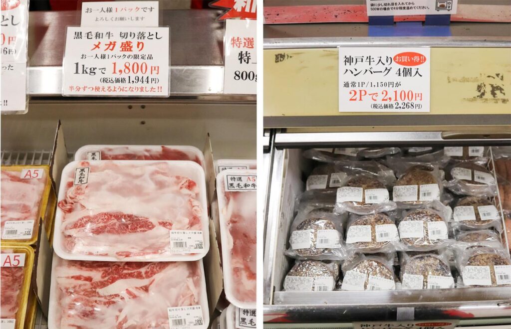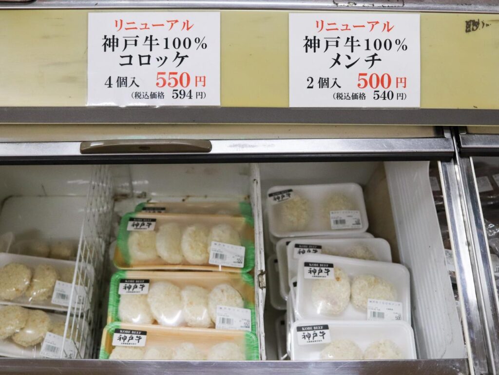 冷ケースの中に40種類以上の商品がずらりと並んでいる光景は圧巻!神戸牛と黒毛和牛の冷凍肉が整然と陳列され、思わず足を止めてしまいます。