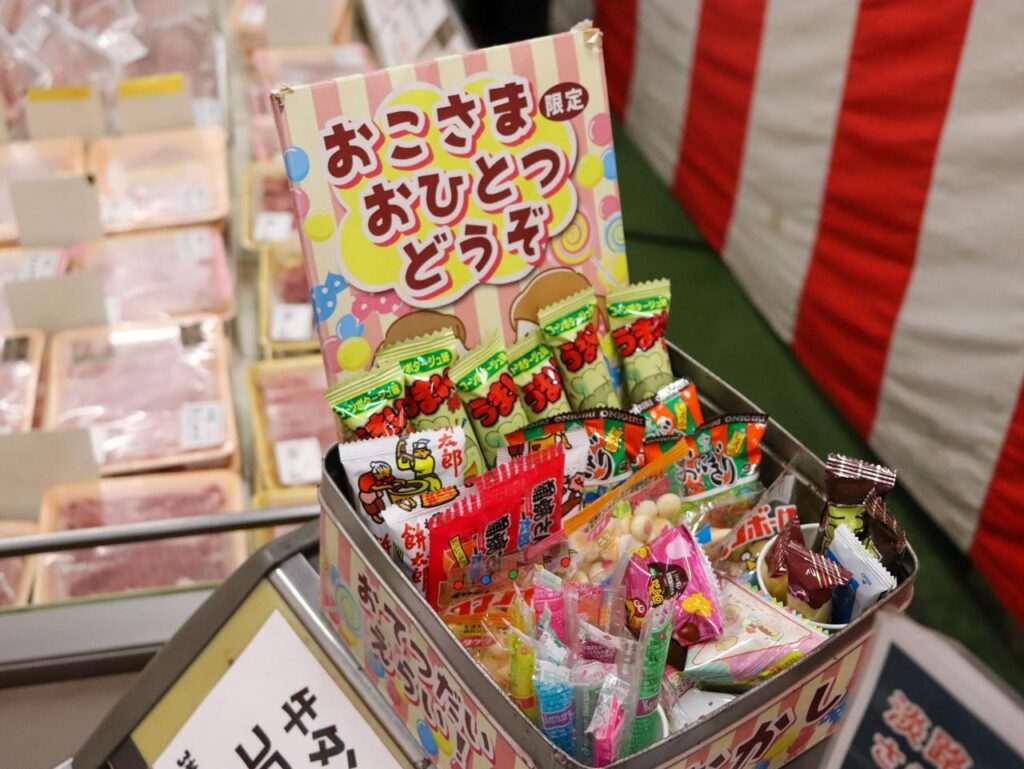 青空市では、小さな子どもを連れたお客さん向けのサービスとして、お菓子をプレゼントしています。お菓子を目当てに早起きしている子どもたちも!お菓子を選んでいる子どもの様子は、とっても微笑ましい光景です。