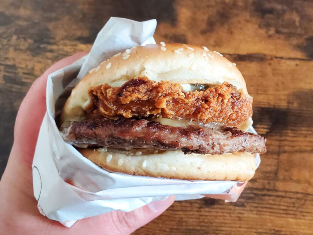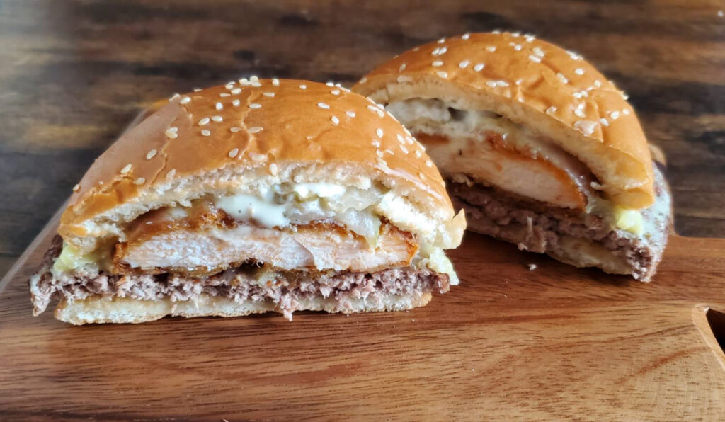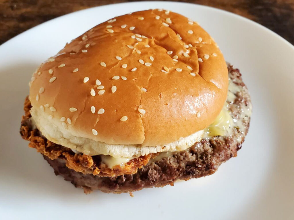 100%ビーフパティと、サクサク&ジューシーなチキンパティを組み合わせた、バーガーキング®らしい遊び心あふれるバーガーです。マヨネーズ入りのホワイトチーズソースと2枚のゴーダチーズが、ビーフとチキンの旨みをまろやかにまとめています。