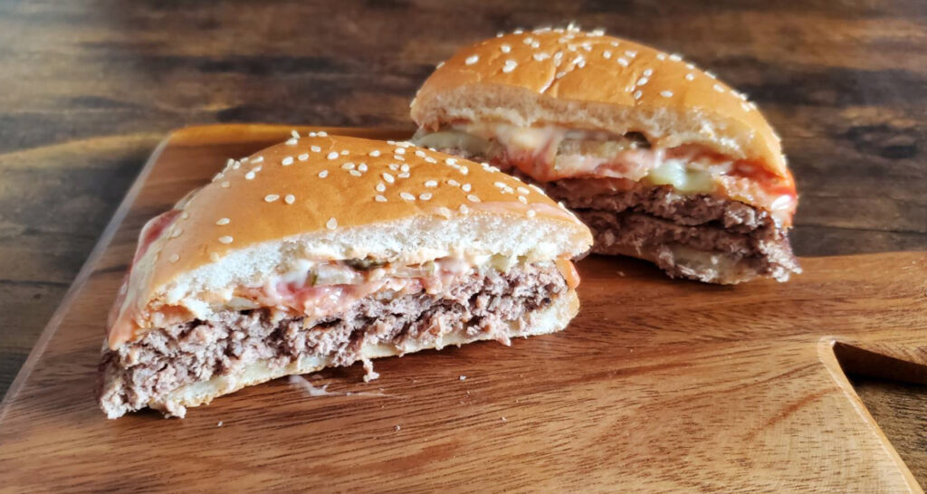 100%ビーフパティ2枚に、スモーキーなベーコン4枚とゴーダチーズ2枚を合わせたボリューム満点のバーガーです。ホワイトチーズソースにケチャップとマヨネーズをプラス。満足感のあるアメリカンな味わいに仕上がっています。