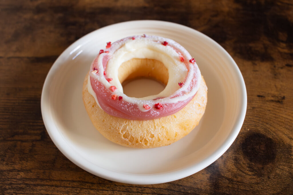 「サクラクリーム」は、桜をモチーフにしたかわいらしいドーナツに桜風味のクリームを詰め込んだ、まさに桜づくしのひと品。クリームはやさしい甘さで、ほんのりと酸味も感じられます。子どもがちょっと背伸びしているような、食べやすさと上品さを合わせた味わいで、春のおやつ時間にぴったり。気分がふわっと華やぎます。