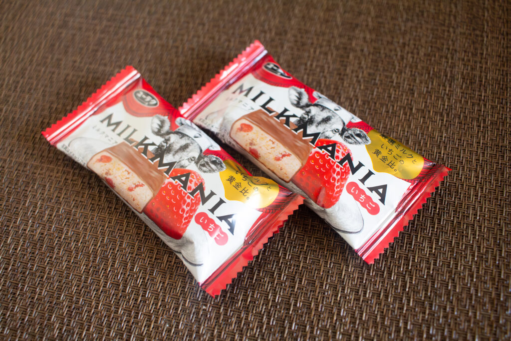「ミルクマニア」といえば、牛のコックが描かれたデザインが目を引くパッケージ。「ミルクマニアいちご」でも、おなじみのデザインは健在です。