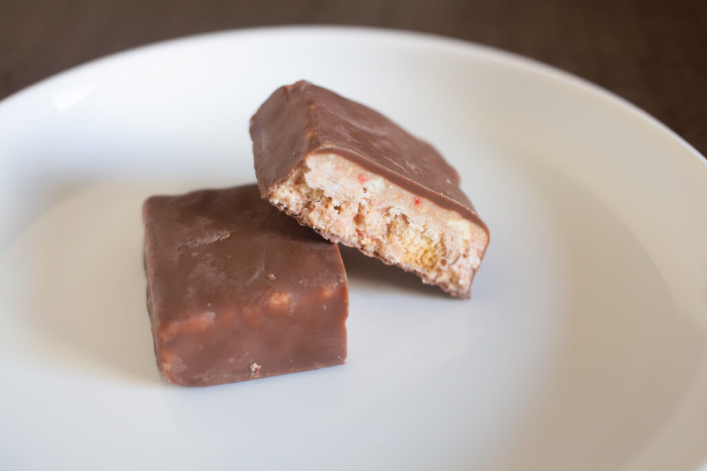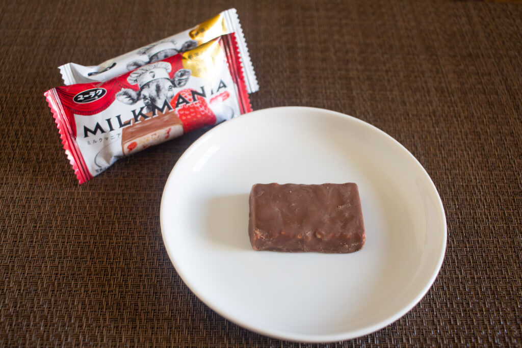 「ミルクマニアいちご」に鼻を近づけると、ミルクチョコレートの甘い香りがふわっと広がります。ブラックサンダーと比べてやや幅広で、ひとつでも満足感を得られるちょうどいいサイズ。ティータイムやリフレッシュしたいときなど、さまざまなシーンで手に取りやすい大きさです。