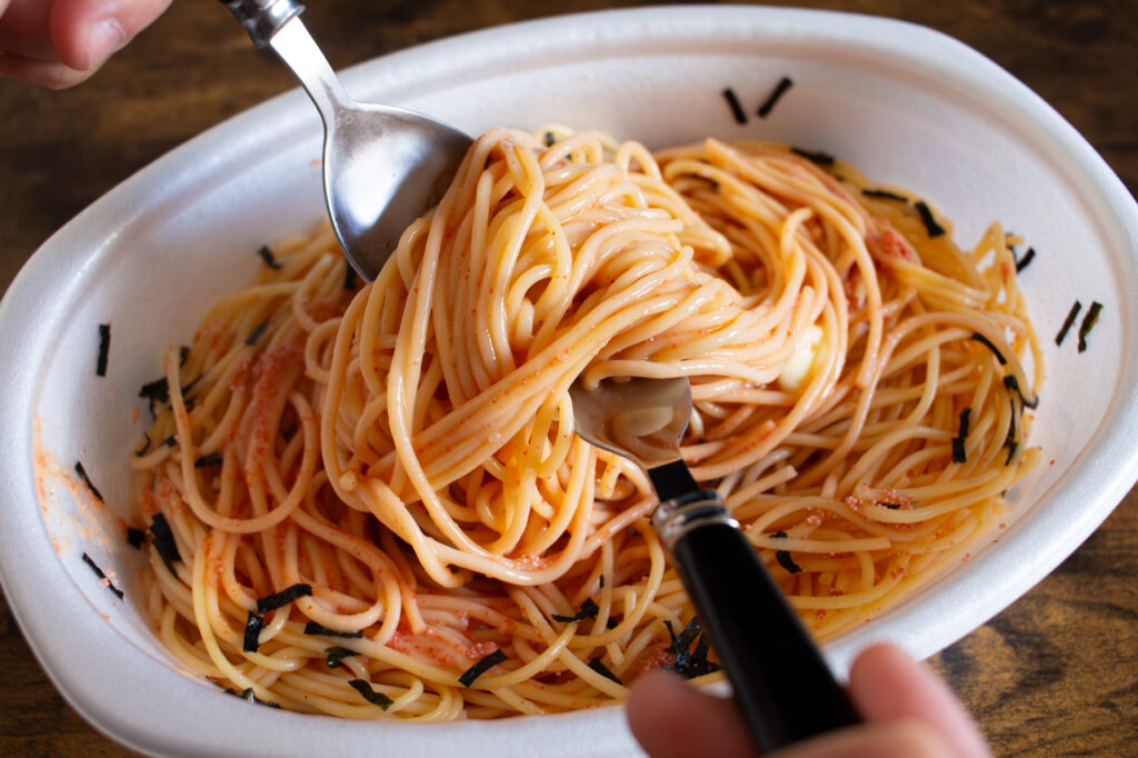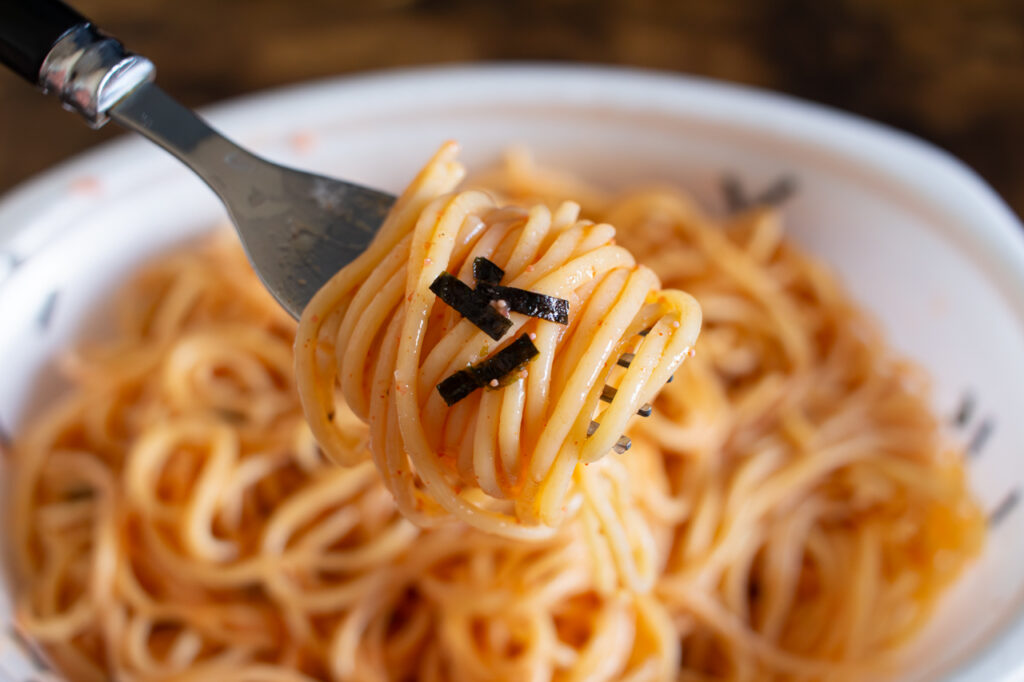 混ぜ始めると、明太子とバターがゆっくりと溶け合い、パスタにとろりと絡んでいきます。麺を持ち上げるたびに、つややかな明太子ソースがしっかりとまとわりつき、全体がほんのりピンク色に。