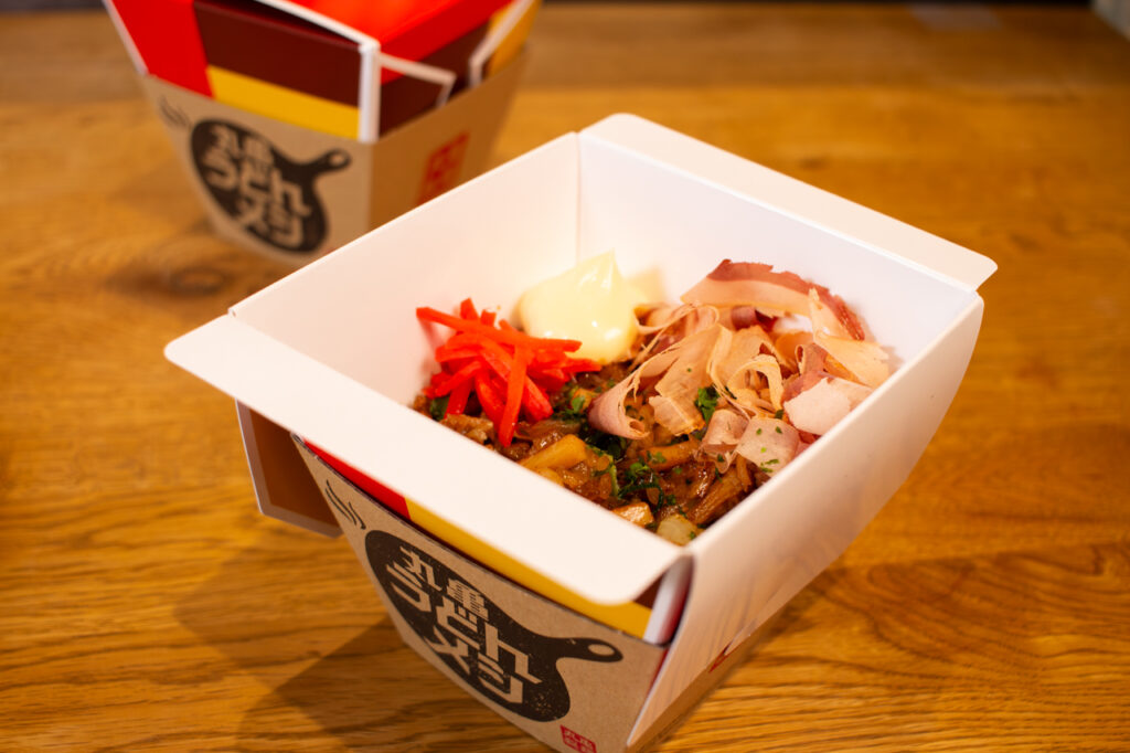 「丸亀うどんメシ ふわ玉ソース味」を除く、4品は専用BOXでテイクアウトができます。外出先やピクニックなど、好きな場所で丸亀うどんメシを気軽に頬張れます。