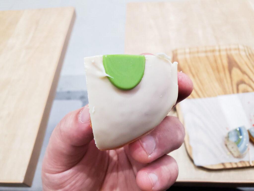 ヨッシーのたまごをドーナツで再現!たっぷりのカスタードクリームを詰め込んだふわふわのドーナツをホワイトチョコレートでコーティングし、プレートチョコで飾り付け。やさしい甘さのホワイトチョコとコクのあるカスタードが相性抜群で、ひと口食べるたびにほっとするような味わいが広がります。見た目のインパクトはもちろん、満足感のある食べごたえも魅力のひと品です。