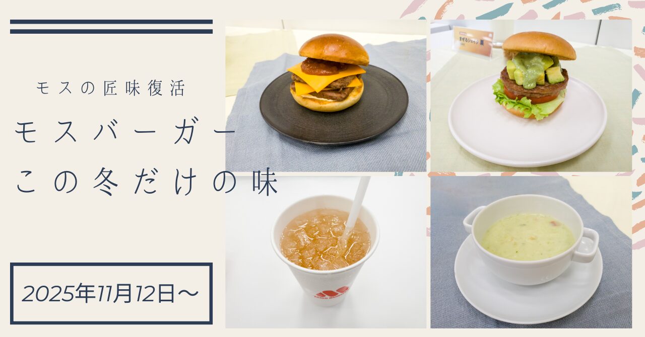 2025年11月12日(水)より、モスバーガーで冬の期間限定メニューが発売中です。注目は、17年ぶりに復活するプレミアムシリーズ「モスの匠味(たくみ)」。黒毛和牛を使った贅沢なバーガーをはじめ、アボカドバーガーや季節のスープ、ドリンクまで、多彩なメニューでこの冬を彩ります。