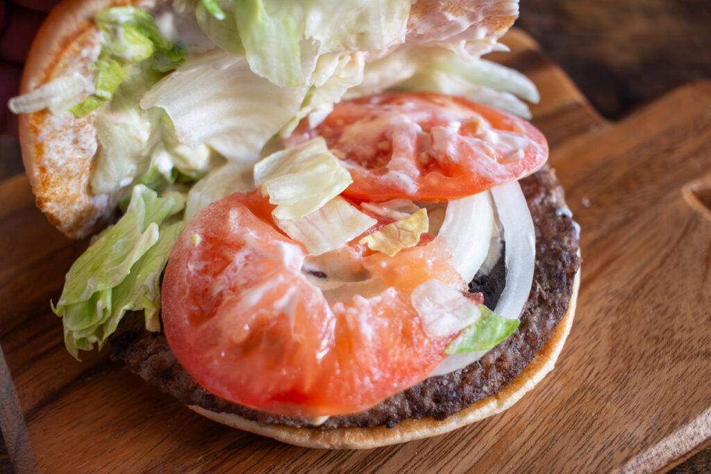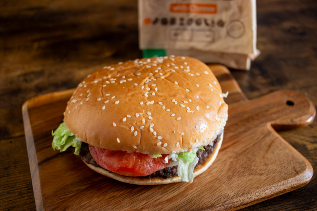 大きくカットされた野菜は量も多く、バンズの上からでも感触がわかりそうなほど。野菜やビーフパティといったインパクトのある具材のなか、ひときわ目立っているのが主役のきのこです。食感や風味の異なる4種類のきのこが贅沢にサンドされており、「ウィンタースペシャル マッシュルームワッパー®」の印象をひと口ごとに変えてくれます。