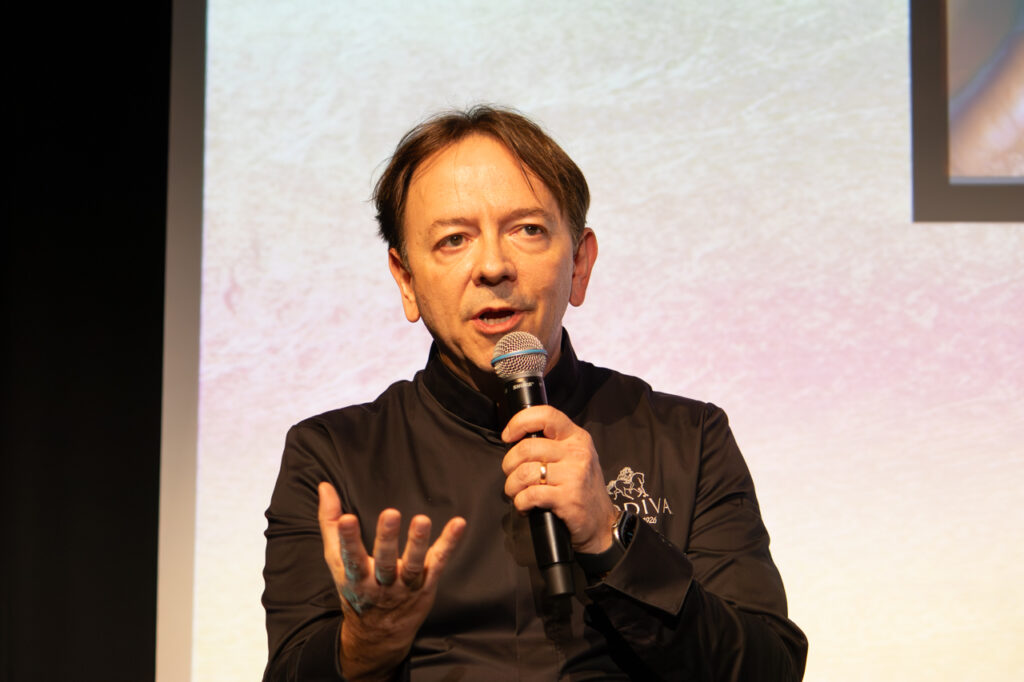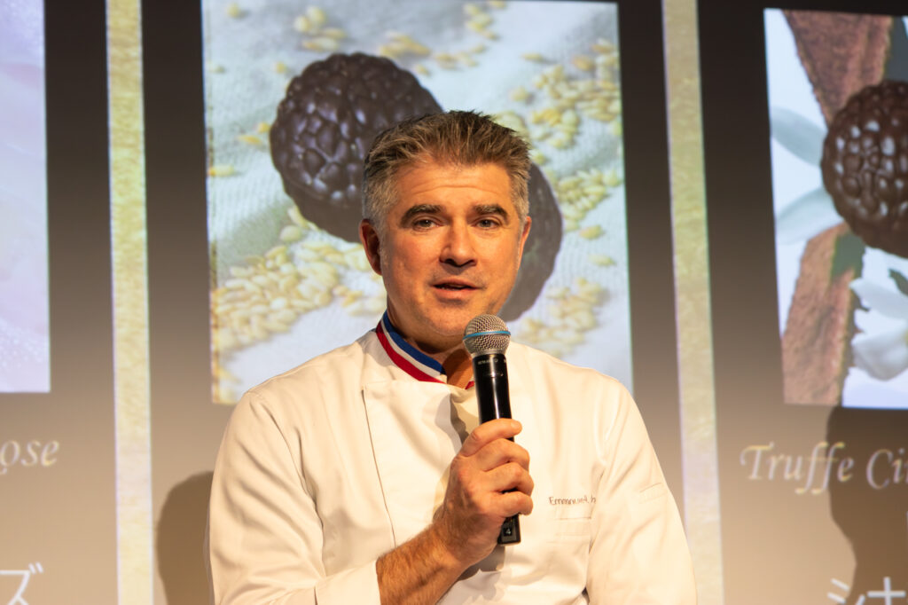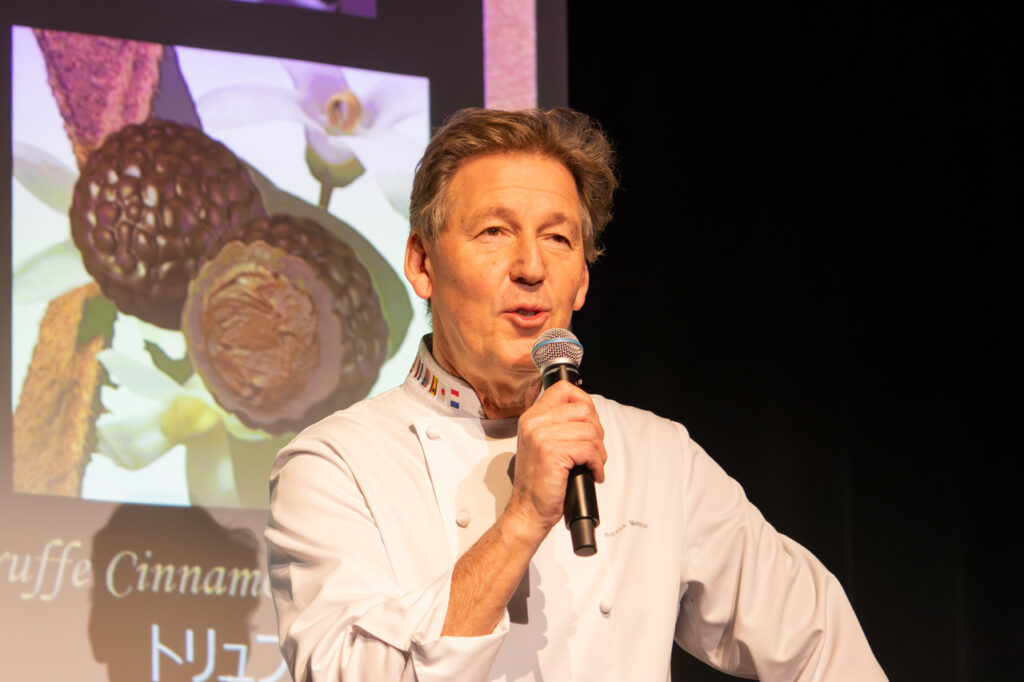 ピエール・マルコリーニ氏は、チョコレートについて、「現在、チョコレートの世界では甘さを抑えたり、塩を加えたりするトレンドがありますが、それは本来カカオが持っている“塩味”に近づこうとする流れでもあります。そこから私たちは“燻製”という新たなアプローチに挑戦しました。燻製の個性を引き立てる素材として選んだのがバニラです。さらにシナモンを加えることで、全体をよりソフトな風味に仕上げています。そして、(料理の)ソースにトリュフをまぶすときのエキサイトする場面のような体験をチョコレートで目指しました」と語りました。