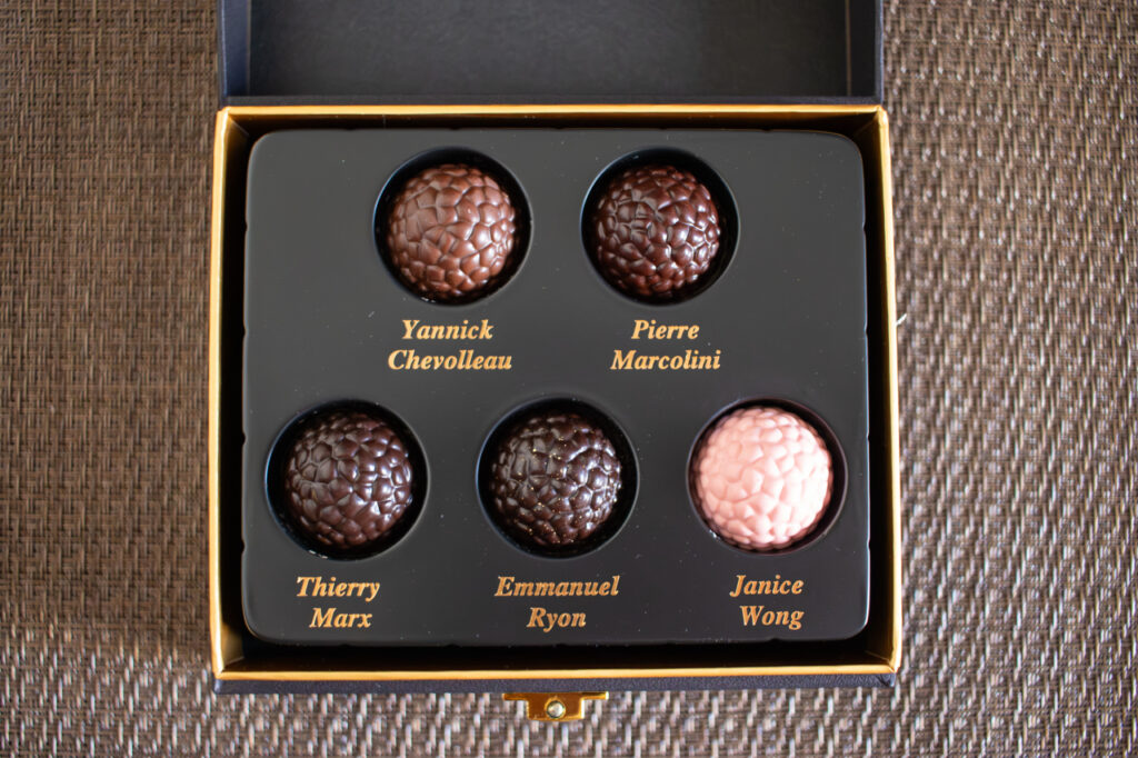 高級感のあるケースを開けると、中には5人のシェフの名前とともにトリュフチョコレートが並びます。