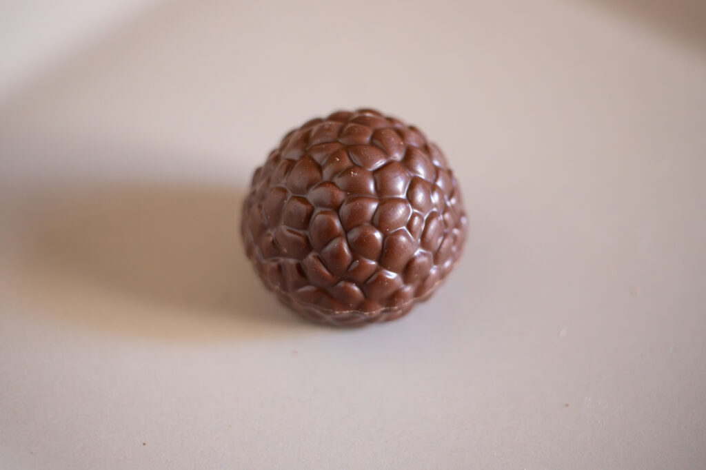 ヘーゼルナッツのガナッシュをミルクチョコレートで包んだ「トリュフ エクラド ノワゼット」。“ヘーゼルナッツの輝き”というネーミングの通り、ナッツの豊かな香りとなめらかなチョコレートが織りなす、シンプルながら奥行きのある上品な味わいを楽しめるひと粒です。